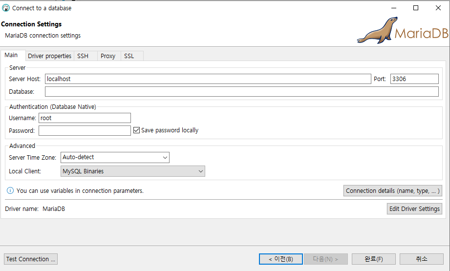 나는 로컬 MariaDB를 사용해서 Server Host에 localhost를 넣었지만 aws rds와 같이 원격 DB를 쓰면 그에 해당하는 Server Host를 넣어주면 된다. 그리고 Port 부분에도 해당하는 포트 번호를 넣어준다. 그리고 Database를 특정하는 경우에는 Database칸에 넣어주고 아니면 빈칸으로 두면 된다. Username과 Password에 DB에 접근 가능한 username과 password 넣어주면 된다.