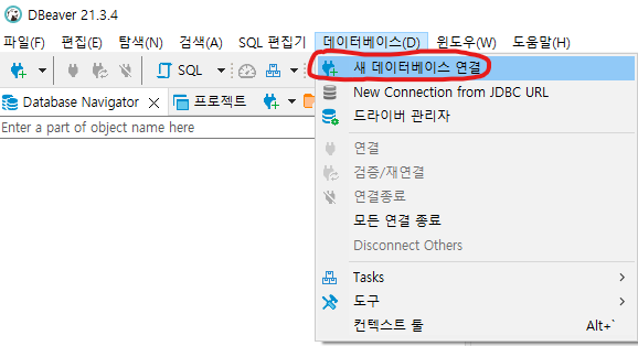 디비버에서 DB를 연결하려면 상단의 데이터베이스 탭에서 새 데이터베이스 연결을 클릭한다.