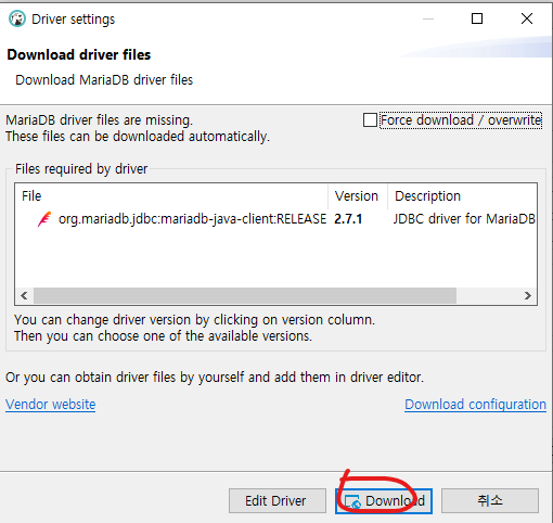 위에서 완료를 클릭한 후 다음과 같이 DB연결에 필요한 driver 설치창이 나올 수 있는데 당황하지 말고 download를 클릭해주면 된다.