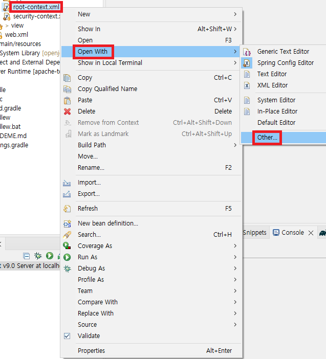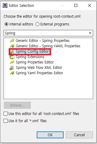 우선 하나 xml 파일 선택한 후 마우스 오른쪽을 클릭하고 Open With의 Other을 들어가서 Spring Config Editor가 있다면 그것을 선택해주면 된다. 만약 없다면 아래 설명하는 과정을 더 시도해봐야 한다.