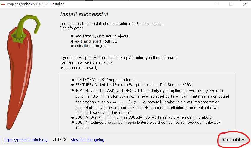 이제 이클립스를 종료했다가 다시 실행시켜주면 lombok을 이클립스에서 사용할 수 있다.