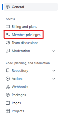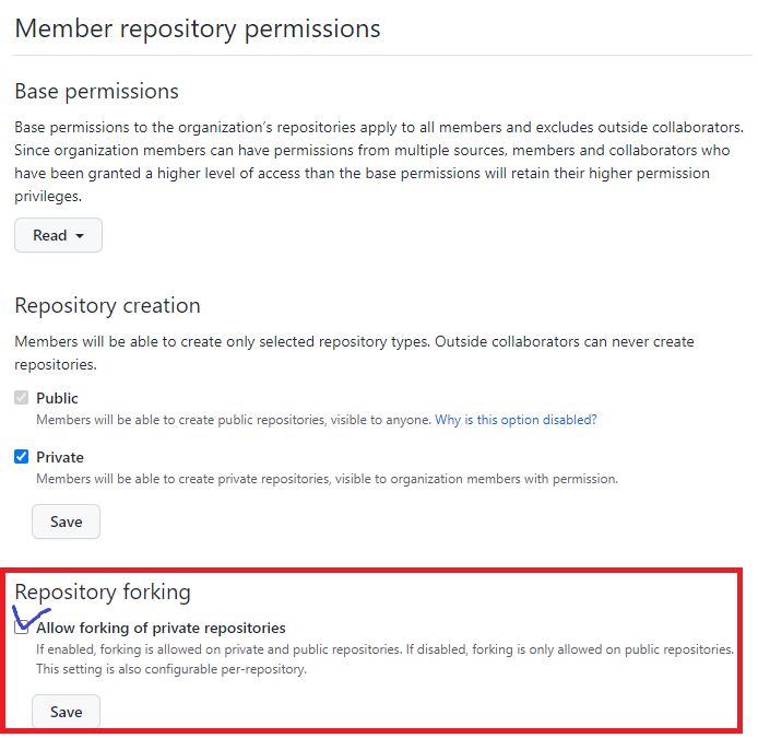 그리고 나서 Member privileges 탭을 선택한다. 탭을 선택하고 나오는 화면에서 Repository forking 부분의 Allow forking of private repositories 부분에 있는 체크 박스를 선택하고 Save 버튼을 눌러준다.
