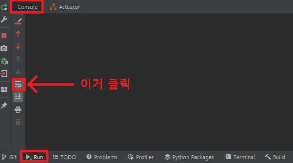 인텔리제이의 로그가 간혹 길어지는 경우 가로 스크롤 혹은 마우스 드래그로 옆으로 가며 로그를 확인해야 한다. 이 로그를 자동으로 줄바꿔져서 보이게 하기 위해서는 Run 탭의 Console에서 Soft-Wrap을 클릭해주면 된다.