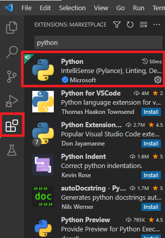 vscode의 확장 기능 아이콘을 누른 후 python을 검색한 후 Microsoft가 만든 Python extension을 설치한다.