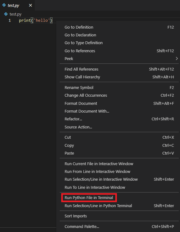 그 다음 해당 파일에서 마우스 우클릭을 한 후 Run Python File in Termianl을 클릭하면 터미널에 해당 파일의 실행결과가 출력된다.