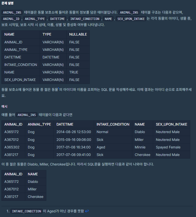 ANIMAL_INS 테이블은 동물 보호소에 들어온 동물의 정보를 담은 테이블입니다. ANIMAL_INS 테이블 구조는 다음과 같으며, ANIMAL_ID, ANIMAL_TYPE, DATETIME, INTAKE_CONDITION, NAME, SEX_UPON_INTAKE는 각각 동물의 아이디