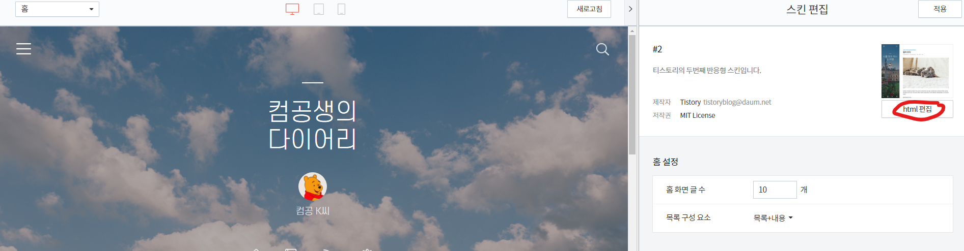 아래와 같이 스킨 편집 화면이 나오면 html 편집 버튼을 클릭한다.