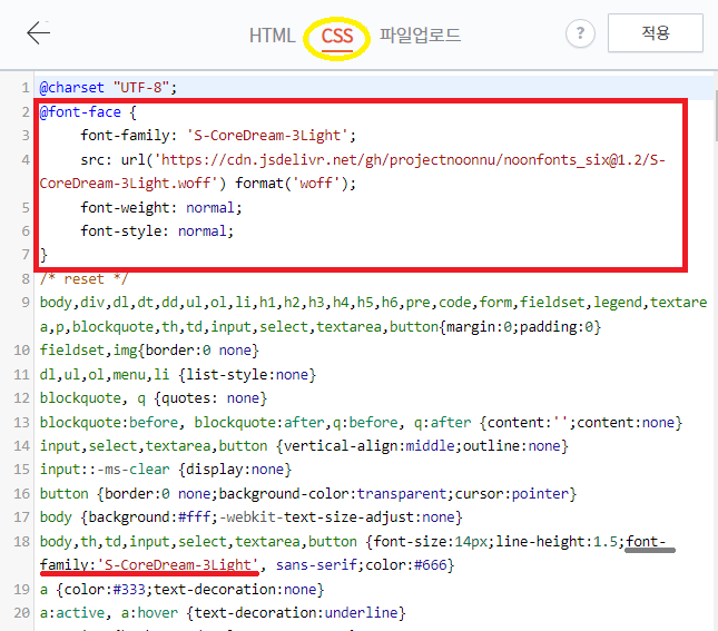 그리고 CSS탭에서 폰트 관련해서 복사해둔 코드를 붙여넣고 font-family를 검색해서 body와 관련된 부분의 font-family를 변경할 폰트명으로 변경해주면 된다. 나의 경우에는 S-CoreDream-3Light로 변경해주면 되었다. 마지막으로 적용 버튼을 클릭해주면 된다.