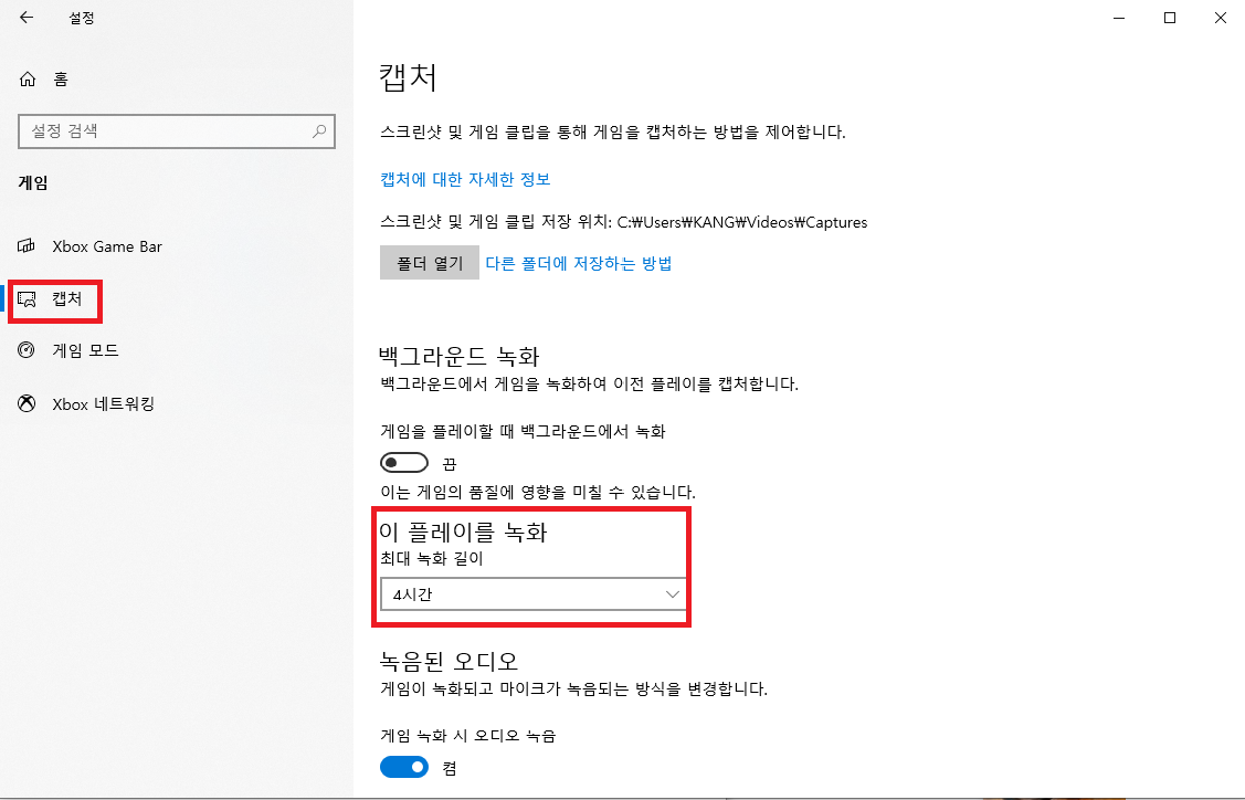 그리고 나서 왼쪽 탭에서 캡처를 클릭 한뒤 아래 표시한 이 플레이를 녹화 부분의 최대 녹화 길이를 30분/1시간/2시간/4시간에서 원하는 것으로 선택하면 된다.