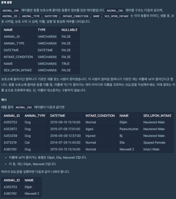 코딩테스트 연습 - 이름에 el이 들어가는 동물 찾기