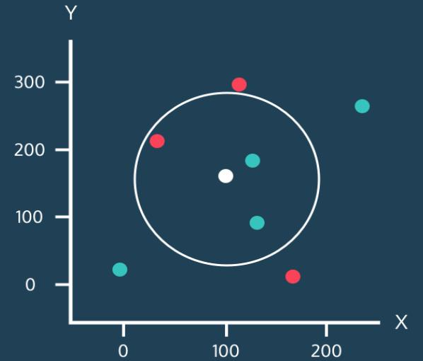 이제 예시를 통해서 kNN을 설명해 보겠다. 아래 그림을 보면 모든 데이터는 각각 x값과 y값이 있다. 그리고 점의 색상은 초록과 빨강으로 표시되었다. 그리고 하얀색 점은 아직 분류가 안 된 새로운 데이터이다. kNN 알고리즘의 목적은 이 새로운 하얀색 점이 등장했을 때 이걸 초록색으로 분류할지 빨강색으로 분류할지 결정하는 것이다.