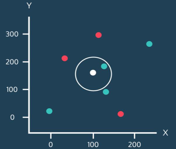 하얀점 주위를 보면 원이 그려져 있고 이 원 안에는 1개의 초록색 점이 있다. 이렇게 원 안에 포함될 이웃의 개수를 k라고 생각하면 된다. 위 그림에서 k는 1이기 때문에, 하얀점은 초록색으로 분류된다.