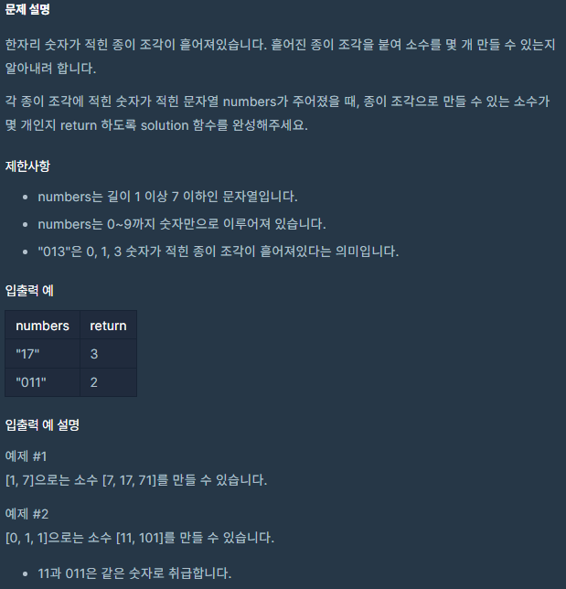 한자리 숫자가 적힌 종이 조각이 흩어져있습니다. 흩어진 종이 조각을 붙여 소수를 몇 개 만들 수 있는지 알아내려 합니다. 각 종이 조각에 적힌 숫자가 적힌 문자열 numbers가 주어졌을 때, 종이