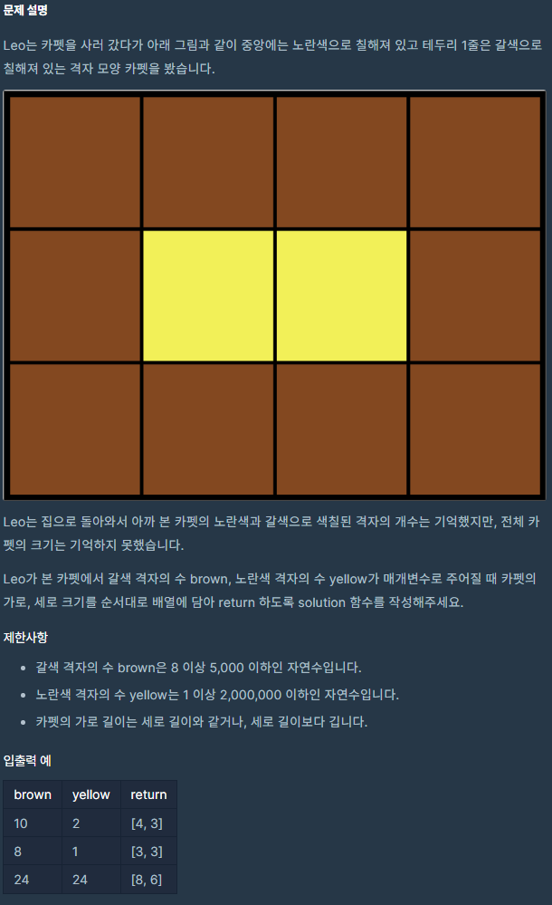 [프로그래머스] 카펫 - 파이썬(Python) 본문