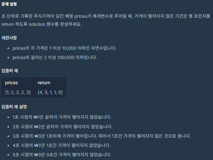 초 단위로 기록된 주식가격이 담긴 배열 prices가 매개변수로 주어질 때, 가격이 떨어지지 않은 기간은 몇 초인지를 return 하도록 solution 함수를 완성하세요. 제한사항 prices의 각 가격은 1 이상 10,00