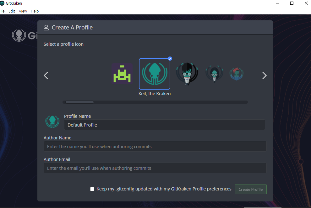 프로필을 설정하라는데 깃허브 정보랑 똑같이 넣었고 혹시나 해서 밑에 체크박스를 해제해주었는데 이것은 편의에 맞게 선택하면 좋을 듯 하다.