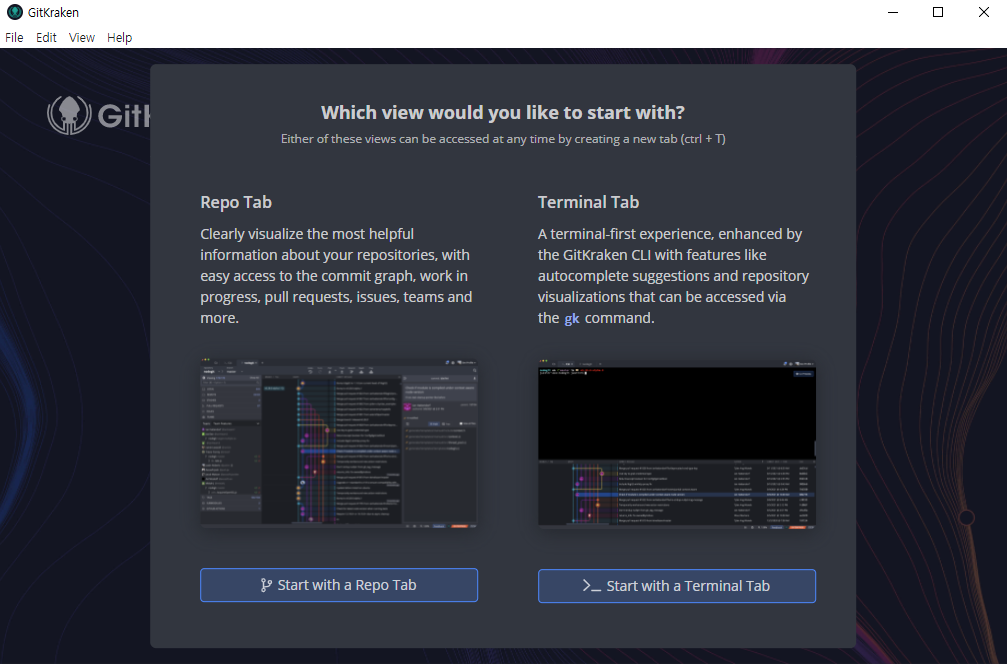 그 다음에는 Repo Tab으로 할지 Terminal Tab으로 할지 선택인데 나는 Repo Tab을 선택했다.