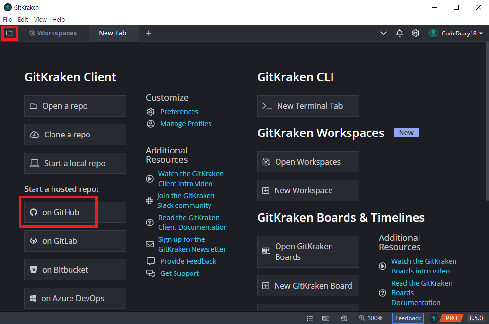 깃허브 학생 프로그램에 가입 되어 있다면 Gitkraken pro를 무료로 사용할 수 있다. pro답게 pro에서 지원하는 모든 기능이 언락된다. 아이디를 생성 한 뒤 깃허브 레포지토리 연동 X sign in with github 클