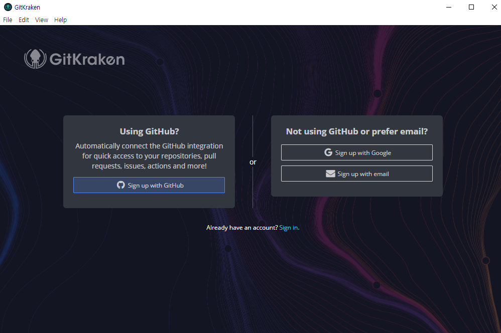 설치파일을 실행시키면 바로 아래와 같이 깃크라켄이 실행될 것이다. 나는 깃허브 계정을 사용할거라 왼쪽의 Sign up with GitHub를 눌러 로그인 해주었다.