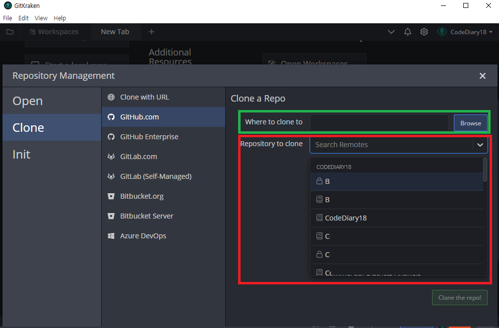 초록색 부분에 어디에 clone할건지 위치를 지정하고 빨간색 부분에서 원격저장소에서 어떤 Repository를 가져올건지 선택해준 후 Clone the repo! 버튼을 클릭하면 저장소가 clone된다.