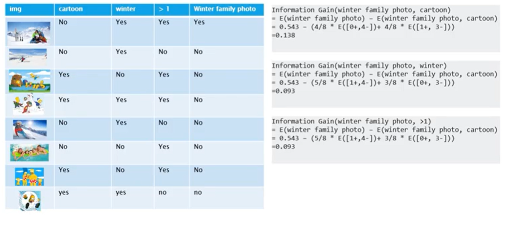 - 주어진 8개의 사진에 cartoon이 아닌 사진 4개 중 겨울 가족 여행사진인 것은 1개이다. 이에 대해 엔트로피를 구해보면 E([1+,3-])이다.