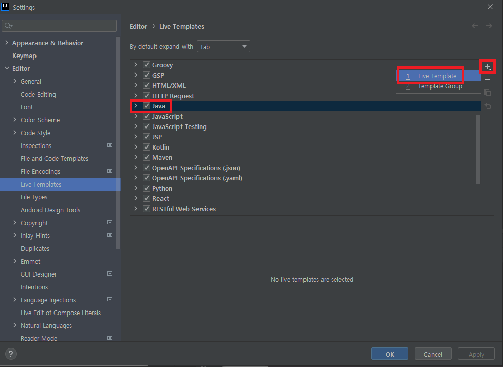 나의 경우 자바 템플릿 코드를 등록하는 거라 Java를 선택했지만 다른 언어를 사용한다면 해당하는 언어를 선택한 후 오른쪽의 + 버튼을 클릭한 후 Live Template을 클릭하면 된다.