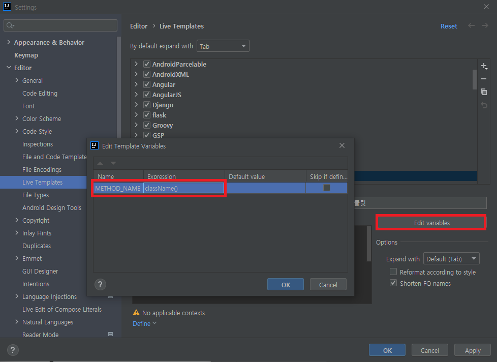 $METHOD_NAME$ 변수 정의를 하기 위해서는 Edit Variables 를 클릭해서 원하는 변수 별로 Expression을 선택하면 되는데 나는 className()으로 선택했다. 이렇게 선택하면 변수의 기본 값이 라이브 템플릿을 사용하는 클래스 이름으로 초기화 된다.