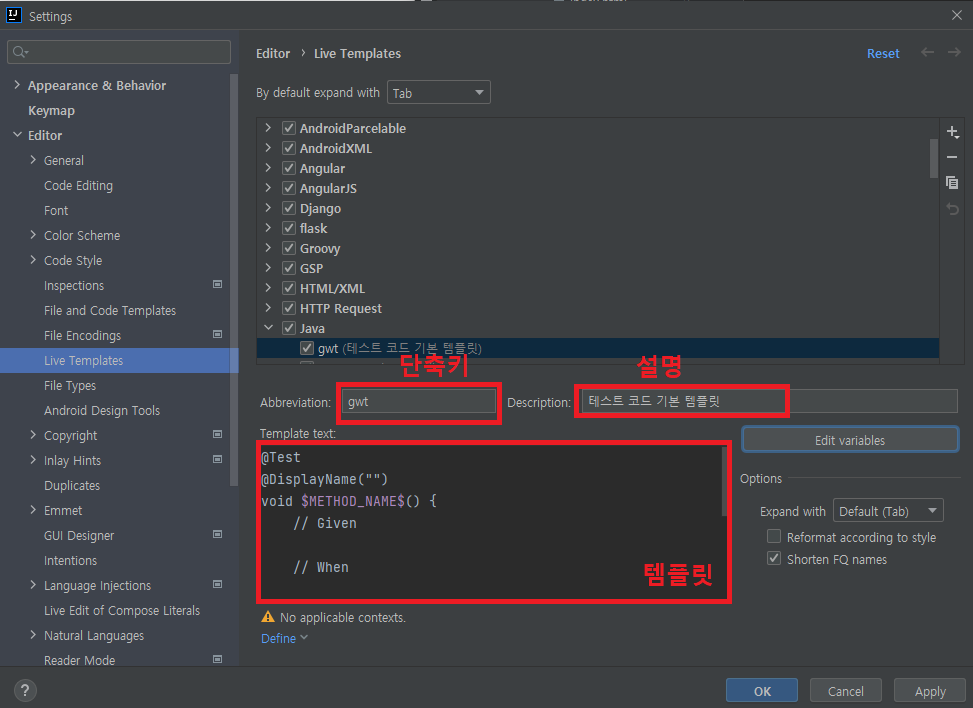 코딩을 하다보면, 똑같은 코드를 계속 치는 경우가 생긴다. 나는 테스트 코드를 작성할 때, 기본 틀을 타이핑하는 것이 너무 귀찮았다.😭 이를 인텔리제이의 Live template으로 해결해보자!