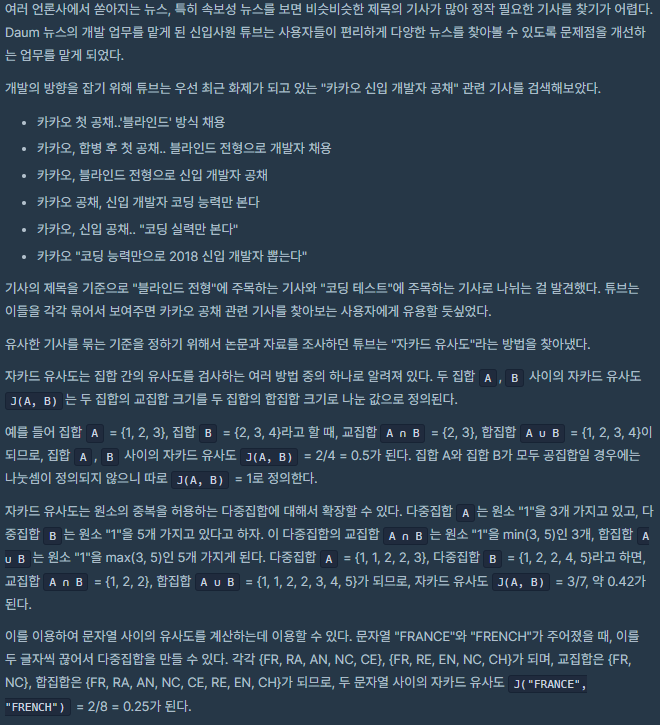뉴스 클러스터링 여러 언론사에서 쏟아지는 뉴스, 특히 속보성 뉴스를 보면 비슷비슷한 제목의 기사가 많아 정작 필요한 기사를 찾기가 어렵다. Daum 뉴스의 개발 업무를 맡게 된 신입사원 튜브