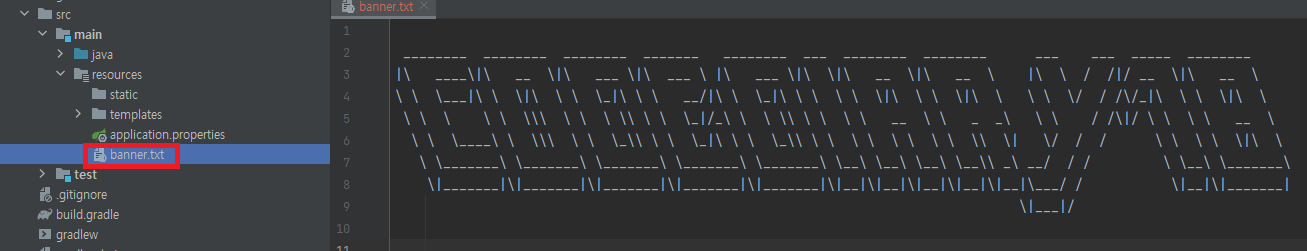 Spring Boot 프로젝트 폴더의 src/main/resources 경로 아래에 banner.txt를 생성해주고 아까 사이트에서 복사했던 배너 혹은 자신이 만든 배너를 넣어준다.