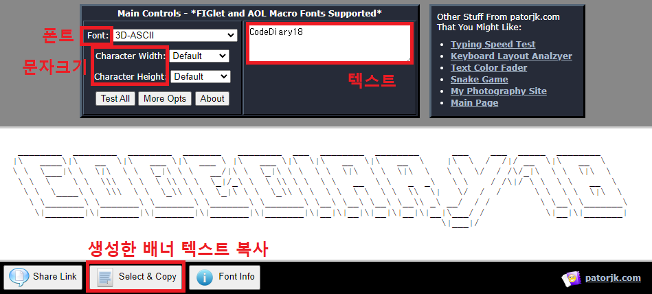 위 사이트를 들어가서 배너에 사용할 텍스트를 입력하고 Font와 문자 크기 등을 아래처럼 자신의 상황에 맞게 설정해주고 생성한 배너 텍스트를 복사한다.