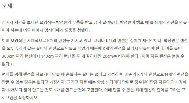 [파이썬, Python] 백준 1654번 : 랜선 자르기 본문