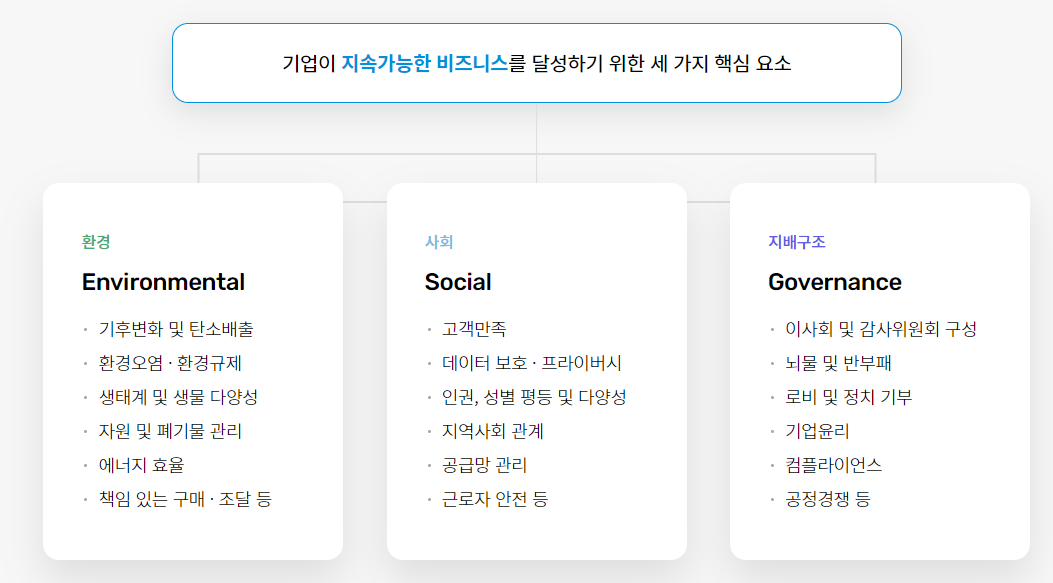 ESG는 환경(Environmental),사회(Social),지배구조(Governance)의 영문 첫 글자를 조합한 단어로, 기업 경영에서 지속가능성을 달성하기 위한 3가지 핵심 요소입니다. 기업의 지속적인 성장 및 생존과 직결