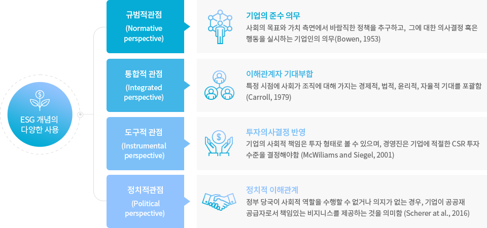 ESG 개념은 아래와 같이 규범·통합·도구·정치적 관점으로 다양하게 해석될 수 있다.