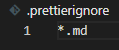 마크다운 문서 혹은 특정 파일, 확장자를 가진 것에 대해 Prettier 적용을 제외해주고 싶다면 작업하고 있는 폴더 바로 아래 .prettierignore 파일을 생성해준 후 .gitignore 파일 작성해주듯이 설정해주면 된다. 아래와 같이 작성해주면 마크다운 문서에 대해서 Prettier 적용이 해제된다.
