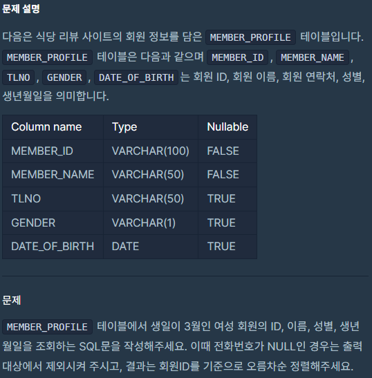 [프로그래머스] 3월에 태어난 여성 회원 목록 출력하기 - MySQL