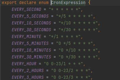@nestjs/schedule 패키지에서 제공하는 CronExpression을 활용하면 아래와 같이 간단하게 주기를 설정해 줄 수 있다. 설정하고자 하는 주기에 대해 찾아보려면 CronExpression 관련 공식문서를 참고하거나 IDE에서 CronExpression을 타고 들어가서 찾아보면 좋을 것 같다.