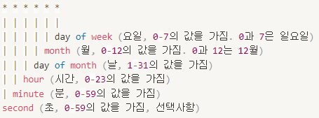공백으로 구분된 여섯 개의 값을 가지는 문자열을 입력해주는 패턴이다. 다섯 자리만 표기하면 초를 0으로 취급한다. *뒤에 /(슬래시)를 붙이고 숫자를 넣어주면 숫자에 해당하는 간격마다 실행할 수 있다. 조금 더 자세한 내용은 아래 패턴과 예시를 참고하면 좋을 것 같다.