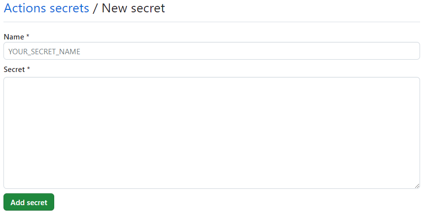 3. Name에는 환경 변수의 키(변수명)에 해당하는 값을 입력하고 Secret에는 키에 해당하는 값을 입력한다.