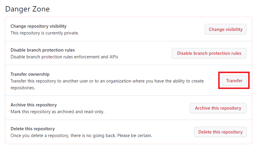 그리고 제일 아래 쪽으로 스크롤하면 아래와 같이 Danger Zone이 나오는데 Transfer ownership의 Transfer 버튼을 클릭해준다.