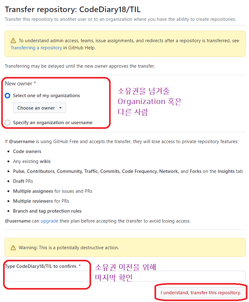 아래와 같이 나오면 소유권을 넘겨줄 Organization을 선택하거나 다른 사람의 username을 입력해서 새로운 저장소의 Owner를 설정한다. 그리고 난 뒤 마지막 확인을 위해 저장소이름을 한번 더 적어준 뒤 I understand, transfer this repository. 버튼을 클릭해주면 된다.