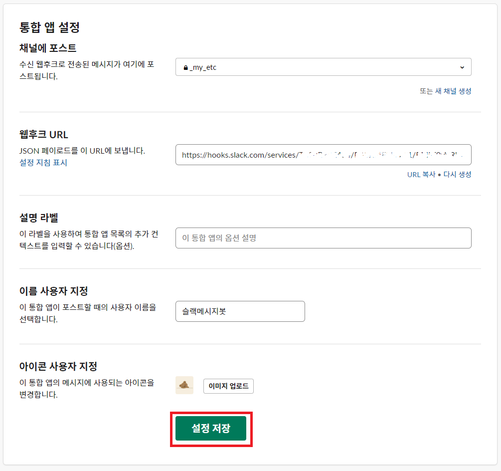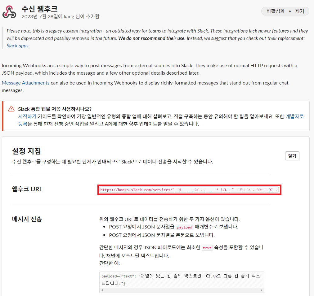 3. 2번에서 버튼 클릭 후 아래와 같은 페이지가 나오는데 설정 지침의 웹후크 URL을 꼭 어디에 복사해둬야 한다. 해당 URL이 메시지를 보내는데 사용된다.