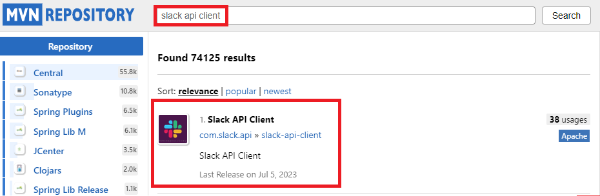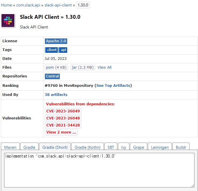 1. mvn repository 사이트에서 slack api client를 검색 후 원하는 버전을 선택해서 dependency를 추가해준다.