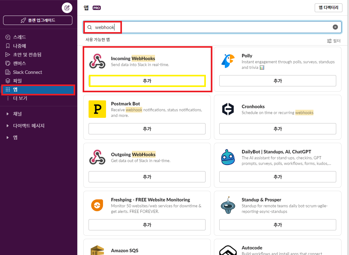 1. 슬랙 앱에서 webhook을 검색한 후 Incoming WebHooks를 추가한다.