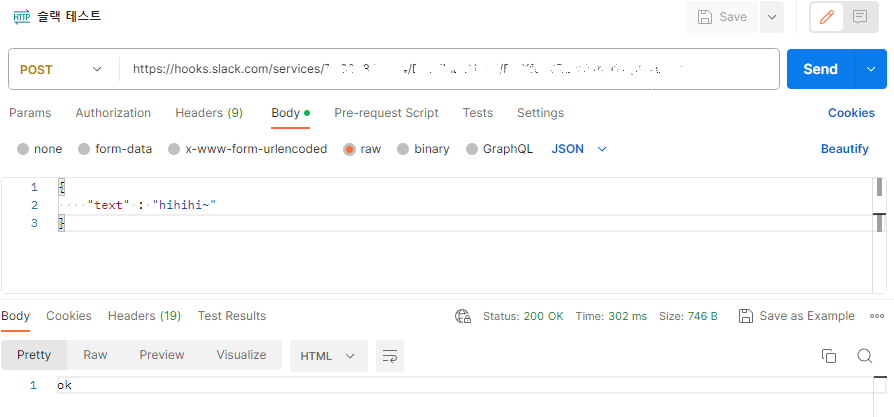 5. SpringBoot로 메시지 보내기 전 슬랙이 잘 설정되어 있는지 보기 위해서 curl 명령어나 Postman으로 테스트해보면 된다. 윈도우 환경이라 그런가 개인적으로는 Postman이 간편했다.