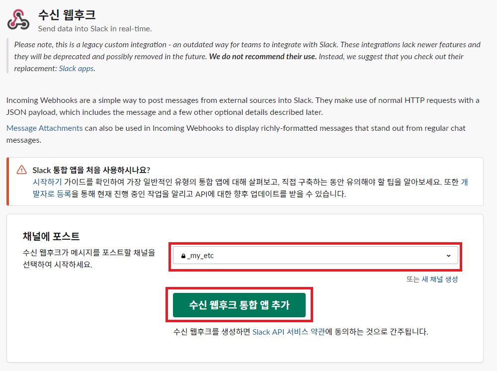 2. 추가 버튼 클릭 후 어떤 채널에 포스트할지 선택을 한 후 수신 웹후크 통합 앱 추가 버튼을 클릭한다.