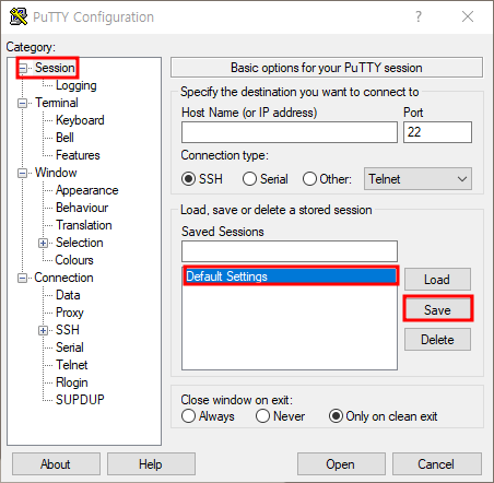 방금 변경한 출력 라인 수 설정을 일시적으로 사용하는 것이 아닌 기본 설정으로 사용하고 싶다면 Session으로 가서 아래와 같이 Default Settings를 클릭 후 Save 버튼을 눌러 설정을 저장해주면 된다.