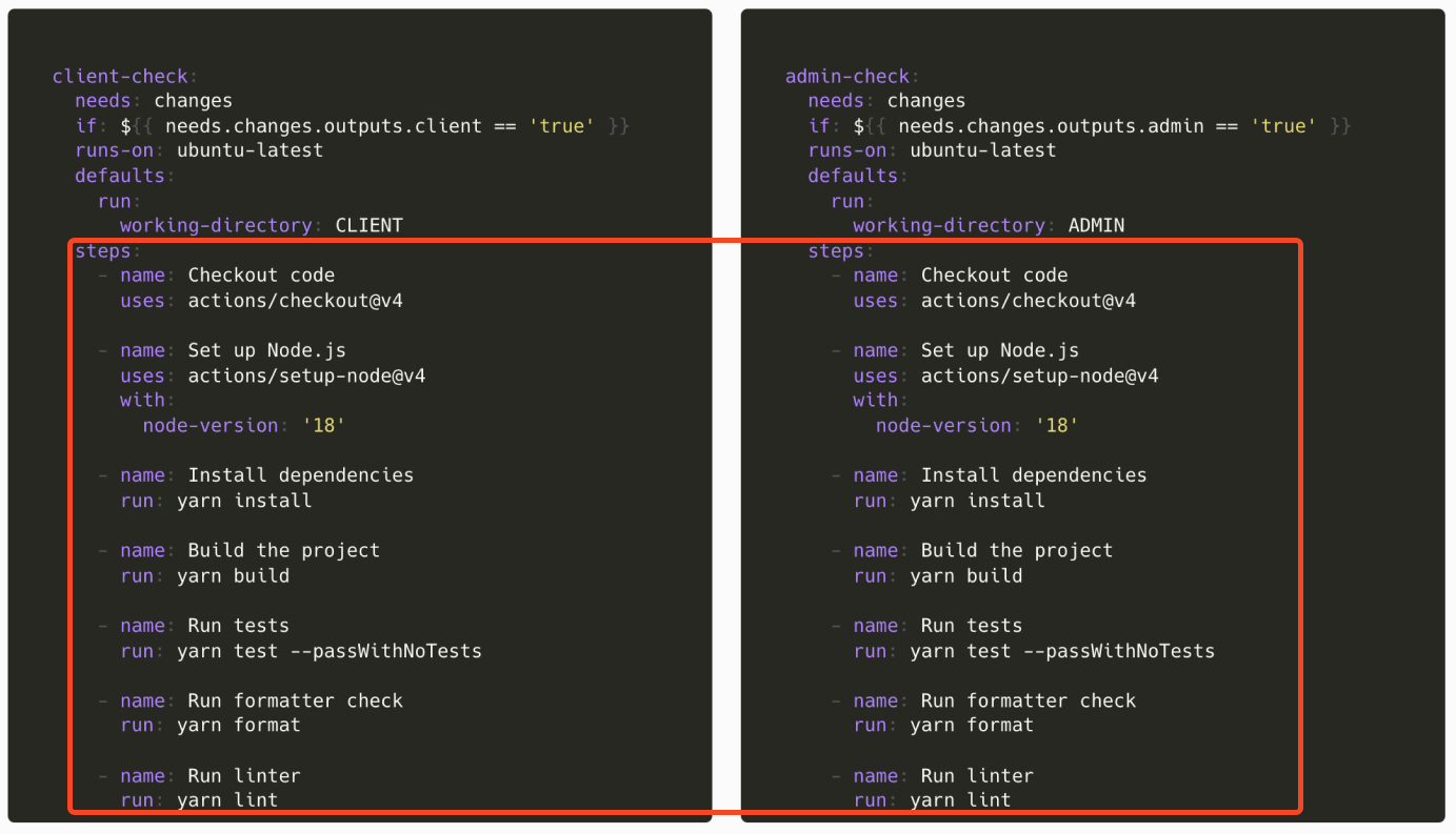 워크플로우 재사용을 적용해볼 예시는 다음과 같다. 같은 워크플로우에 client-check와 admin-check job은 실행 조건과 작업 디렉토리 설정 값을 제외한 나머지 로직이 동일하다.