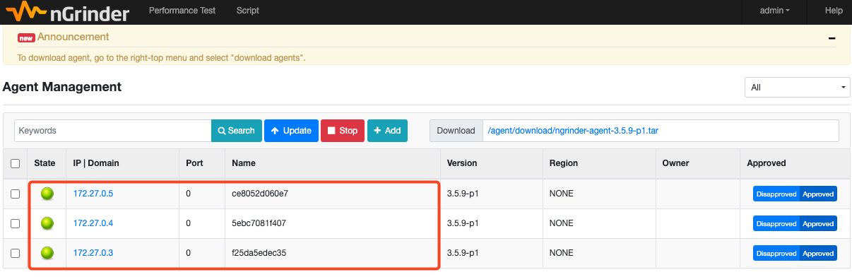 ngrinder-agent-3.5.9-p1-127.0.0.1.tar 이라는 파일명으로 다운받아졌는데 재사용성을 위해 agent.tar로 변경 후 ngrinder-agent 디렉토리 하위로 이동시켜주었다.
