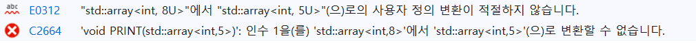 PRINT() 함수의 매개변수 데이터 타입에 전달받을 배열 크기가 고정되어 있기 때문에 다른 크기의 배열을 전달할 수 없다. 만일 std::array<int, 8>을 PRINT() 함수에 전달하면 컴파일러는 아래와 같이 함수 매개변수와 일치하지 않는다거나 또는 해당 매개변수 형식으로 변환할 수 없다는 에러메시지를 출력할 것이다.